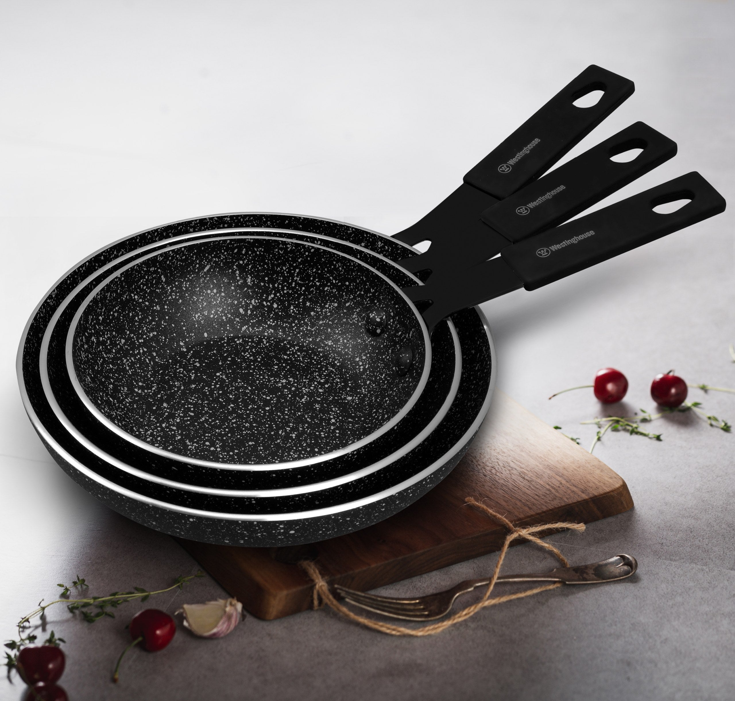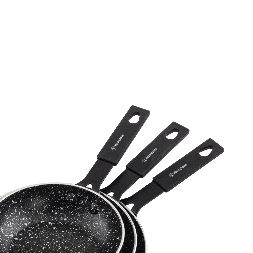 Introducing the Black Marble Series with Wooden Handle 3-Piece Mini Fry Pan Set from Westinghouse – the perfect collection for small-scale cooking and quick meals! This set includes three mini fry pans, each designed with a stylish black marble non-stick coating that ensures effortless food release and easy cleanup.