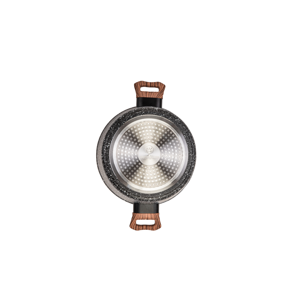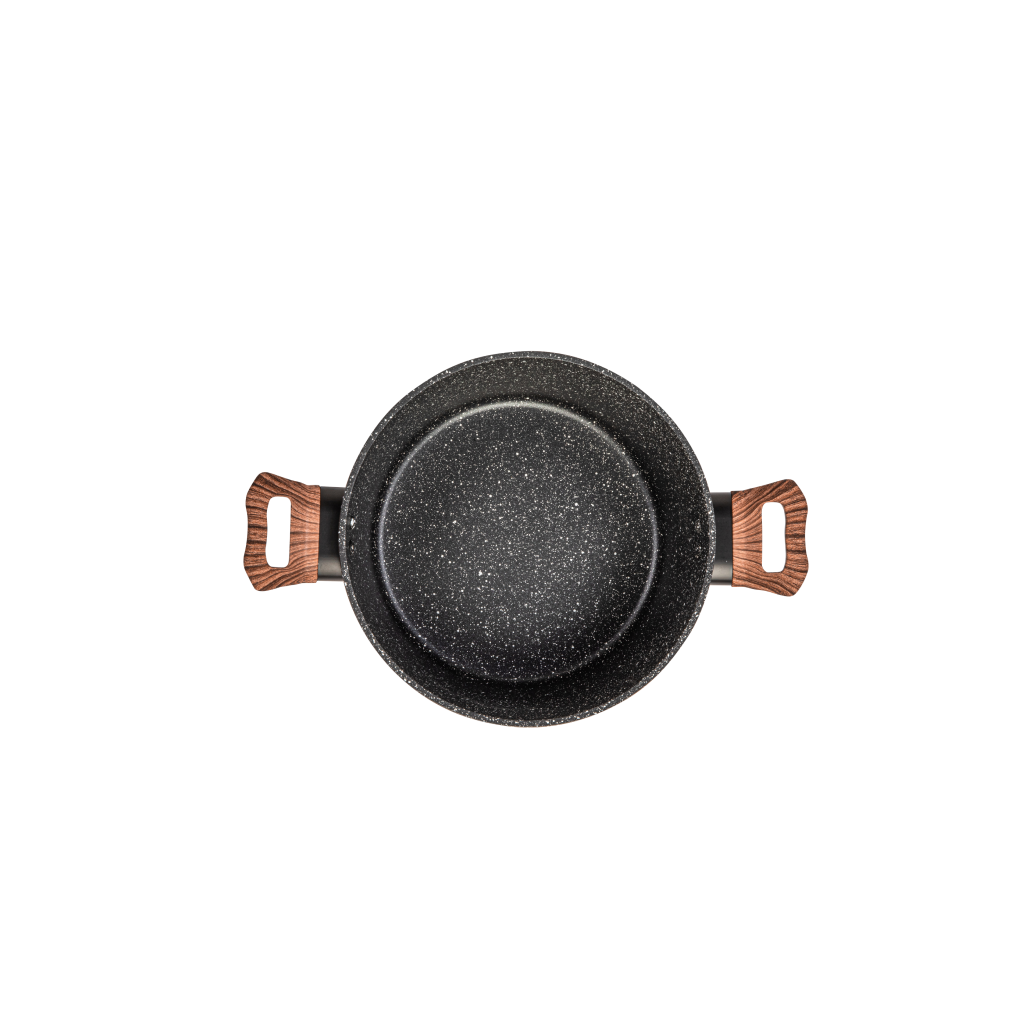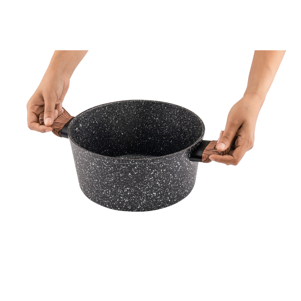 Crafted from forged aluminum with a 3-layer marble coating, this special edition cookware ensures even heat distribution for perfectly cooked meals. The scratch-resistant surface provides lasting durability, while the riveted silicone-coated handles offer a secure and comfortable grip with a chic wood-look finish. Cooking has never been easier with its dishwasher-safe feature, making cleanup a breeze after enjoying your favorite dishes. The transparent glass lid allows you to monitor your food as it cooks, ensuring the best results every time.