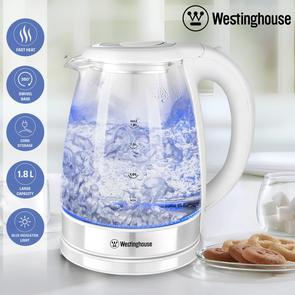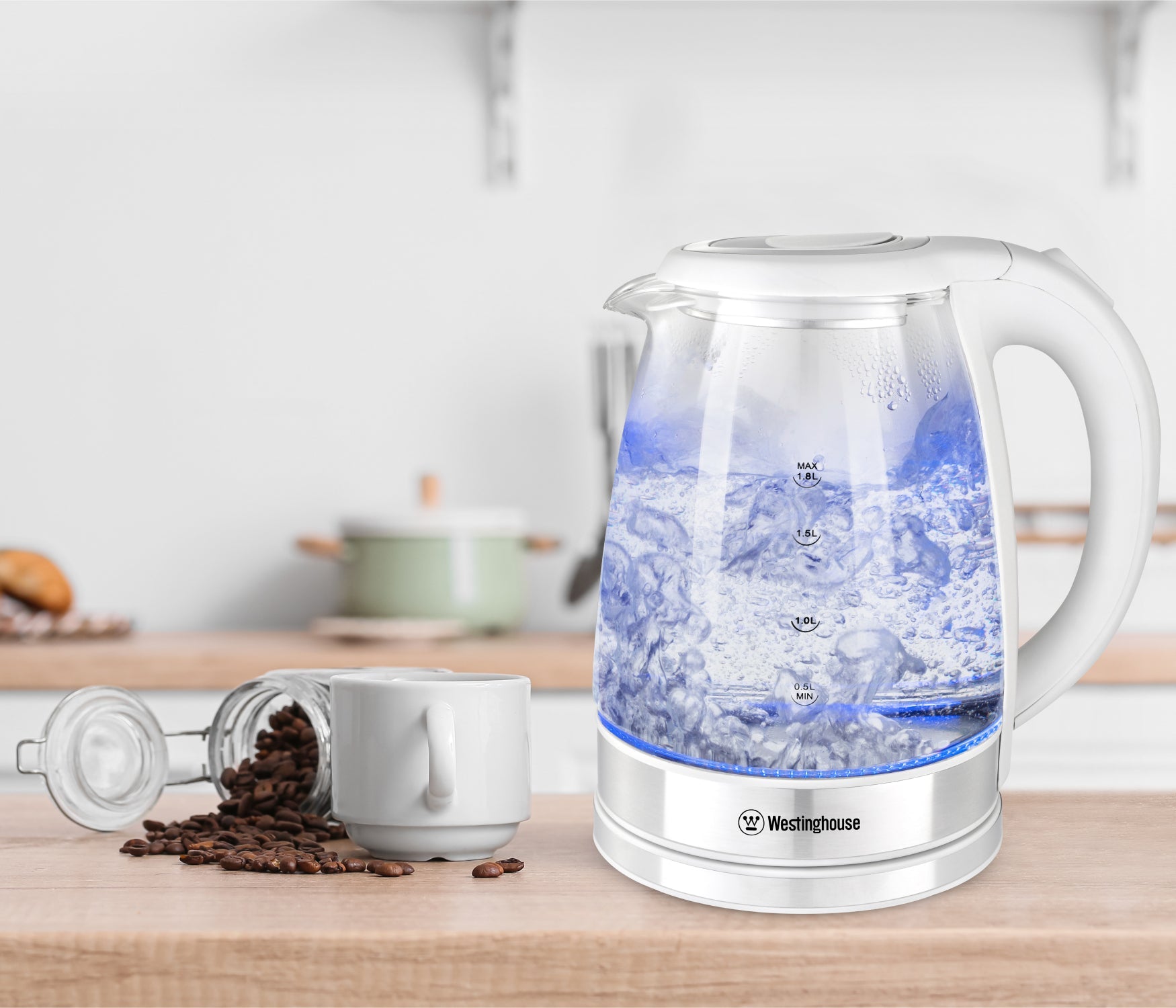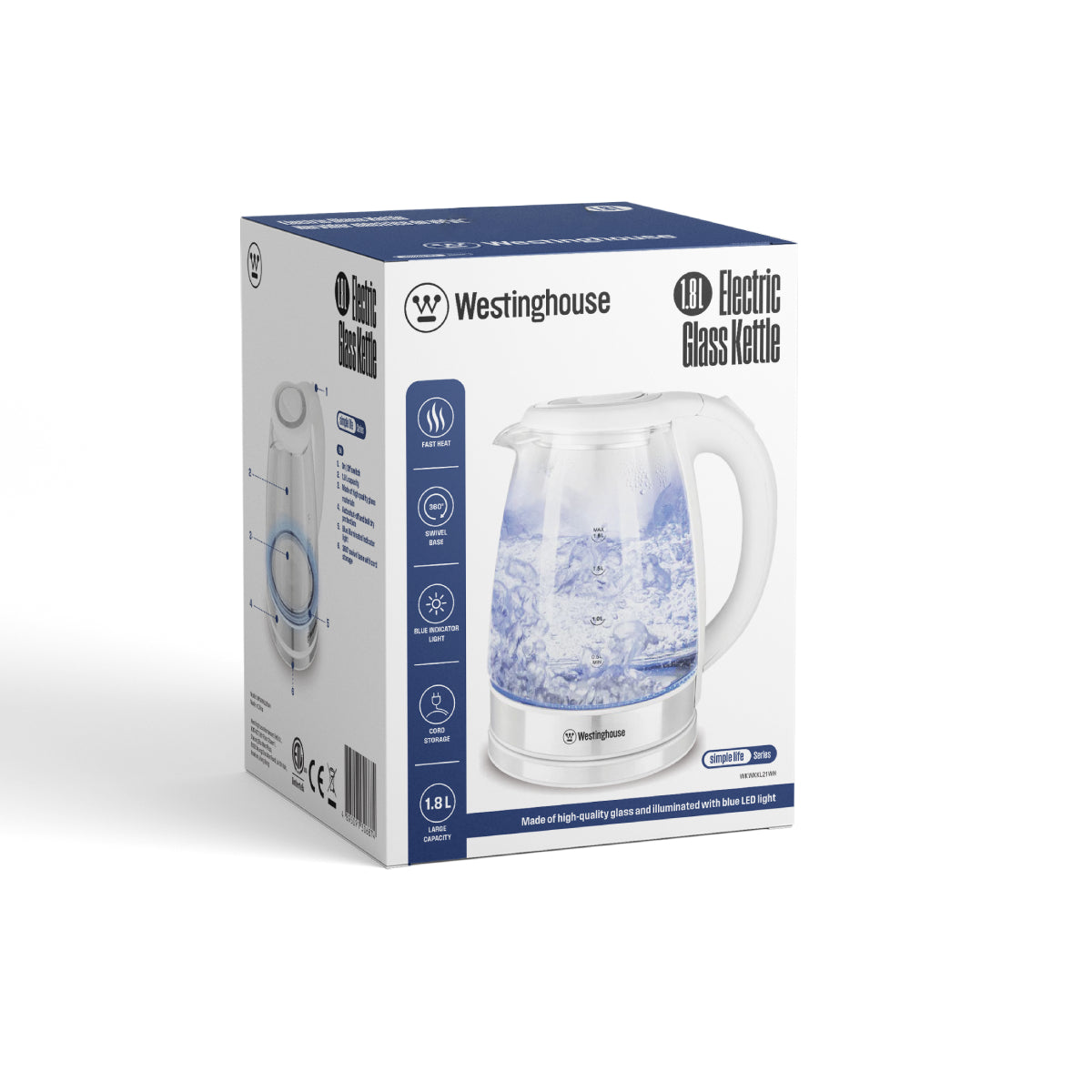 levate your countertop with the Westinghouse Simple Life Series 1.8L Electric Glass Kettle—a perfect blend of modern design and reliable performance. Its large 1.8L capacity makes it ideal for tea, coffee, instant noodles, and more, ensuring you always have enough hot water on hand.